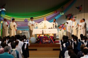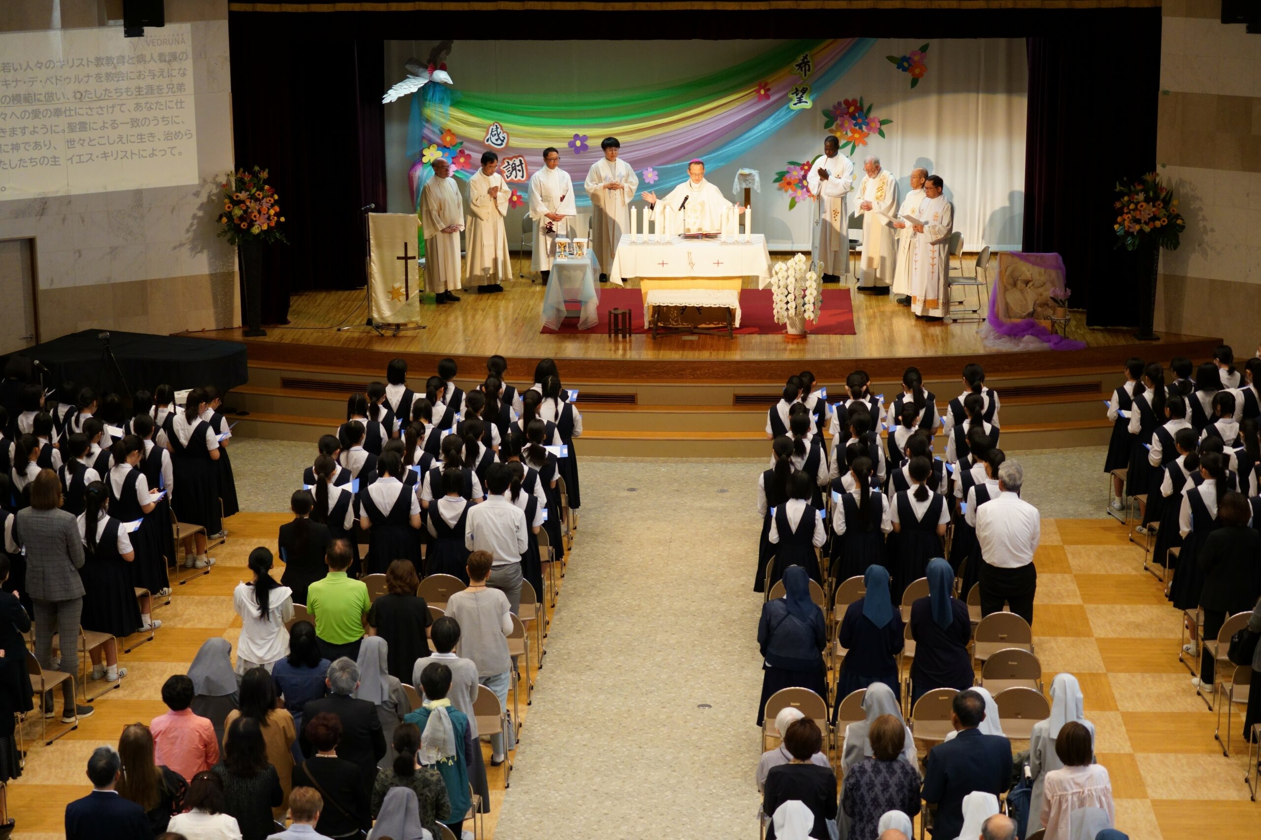 La Celebración Eucarística de cierre del Año Jubilar aconteció el día 14 de junio de 2025, con la presencia del Obispo Auxiliar de Osaka-Takamatu, D. Paulo Tosihiro Sakai y ocho sacerdotes de las parroquias donde trabajan las hermanas. Contamos también con la presencia de muchas personas de varias parroquias, alumnas y exalumnas, profesores y funcionarios de nuestro Colegio y de Parvularios. El ambiente era familiar y muy intercultural, gracias a la presencia de hermanas y profesores de diversas nacionalidades.