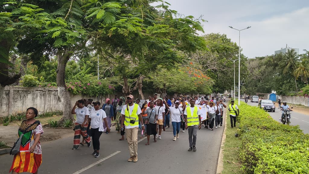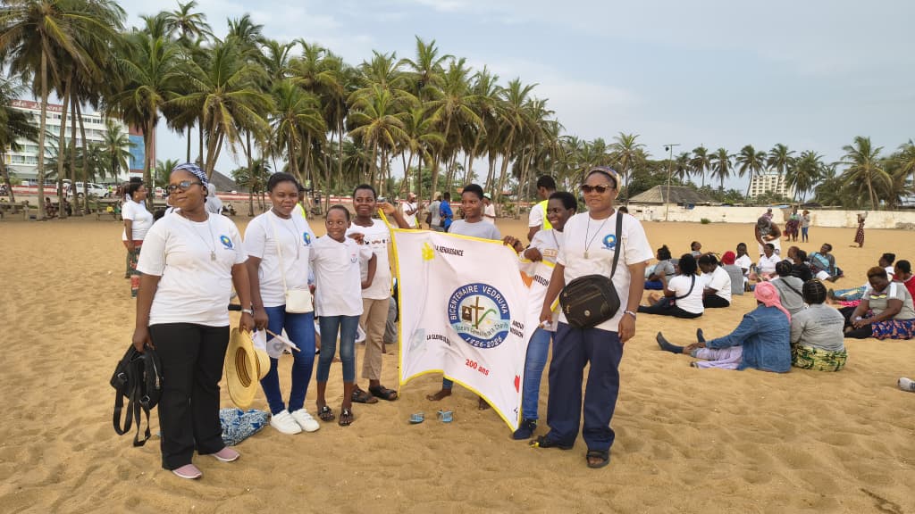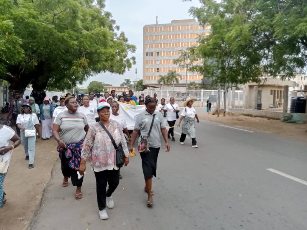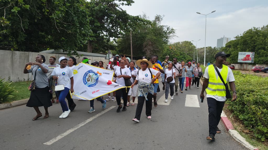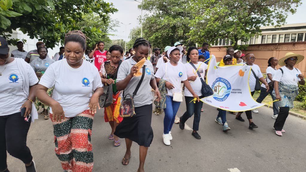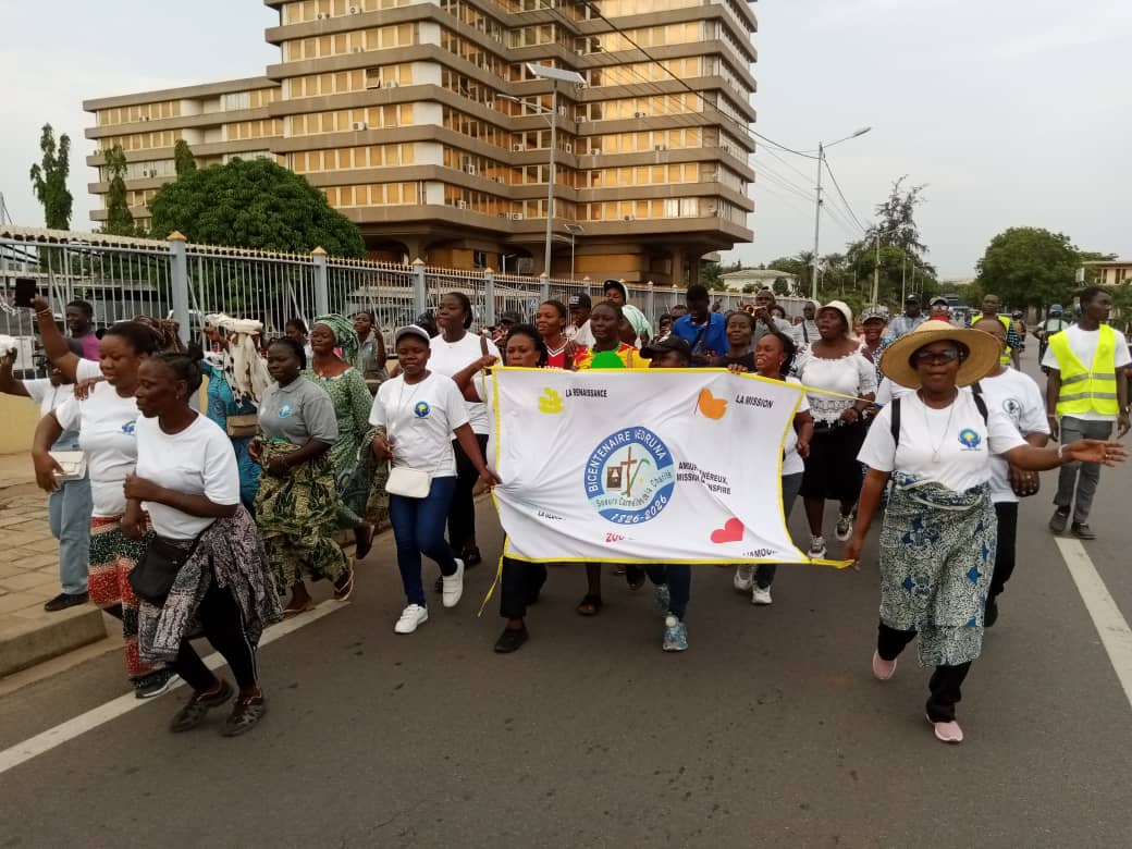 La caminata comenzó en el propio Centro Kekeli. Desde allí las hermanas y toda la comunidad recorrieron las calles del barrio de Hanoukopé hasta llegar a la plaza frente al hotel Lébénè. La marcha fue animada por una banda de música para dar más visibilidad a los participantes, que los animaban con melodías cantadas a coro para olvidar el cansancio y avanzar con valentía.