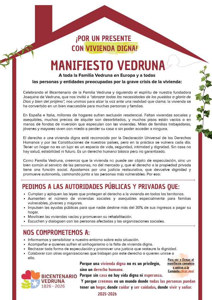 La campagne dénonce la situation d’exclusion résidentielle qui touche actuellement de nombreuses personnes et familles en Espagne et en Italie, les deux pays de présence de Vedruna en Europe aujourd’hui, où l’accès à un logement décent n’est plus garanti. En tant que Famille Vedruna, nous défendons l’idée que le logement ne doit pas être un privilège, mais un droit fondamental et essentiel.